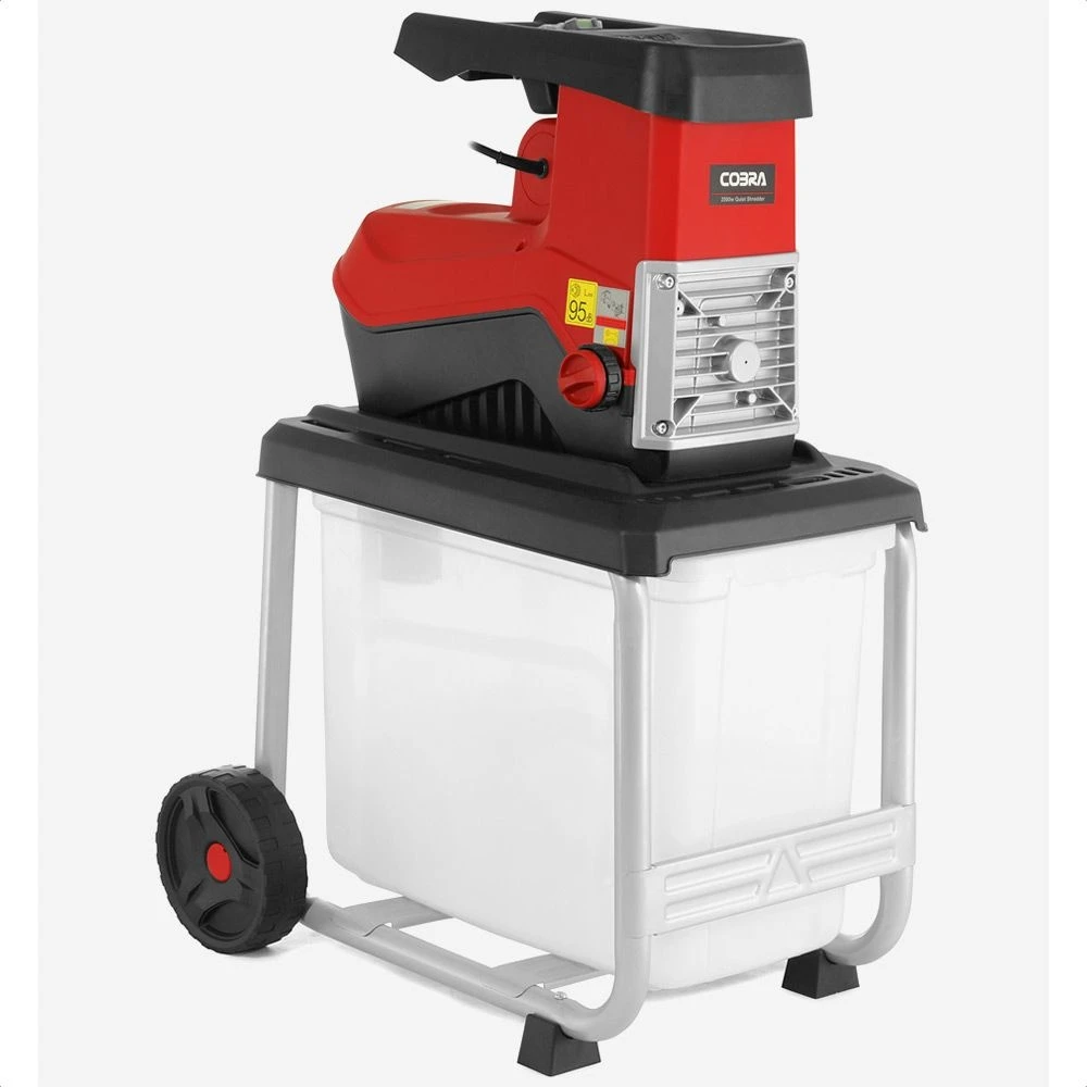 The Cobra QS2500 quiet drum Shredder is ideal for shredding garden waste up to 40mm in diameter and comes with plungger to help feed through the waste, this is also helped due to the powerfull 2500w motor. To ensure shredding garden waste remains a simple and effortless task the ergonomically positioned controls not only make operator use more comfortable, but also make using the Cobra Shredder as safe as possible. The QS2500 is also equiped with a large 50ltr collection ideal for collecting large amounts of garden waste before the need to empty – for added safety a switch wiil auyomatically cut out the motor if the box is removed.