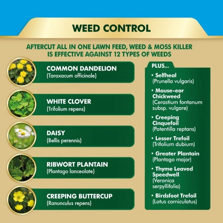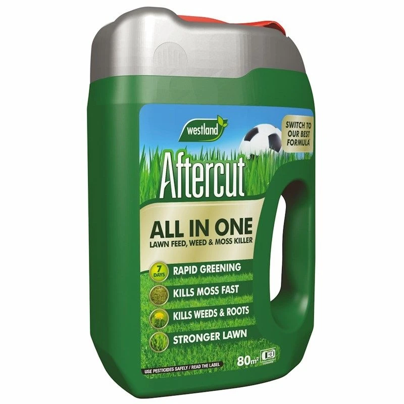Aftercut All In One Lawn Feed, Weed & Moss Killer is a triple action lawn treatment that greens and feeds your lawn, whilst controlling weeds and moss. After 7 days you will see a greener lawn!